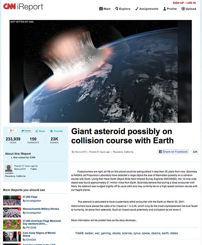 Su noticia había recibido más de 250.000 visitas y fue compartida más de 24.000 veces en Facebook antes de que la CNN reemplazara ese texto con el siguiente: "La NASA ha confirmado a través de correo electrónico que esta historia es falsa. Una portavoz del Laboratorio de Propulsión a Chorro dice que el mayor objeto detectado por NEOWISE es de 3 kilómetros de diámetro y no representa ningún riesgo para la Tierra. Este iReport ha sido eliminado", escribió un productor de CNN iReport.